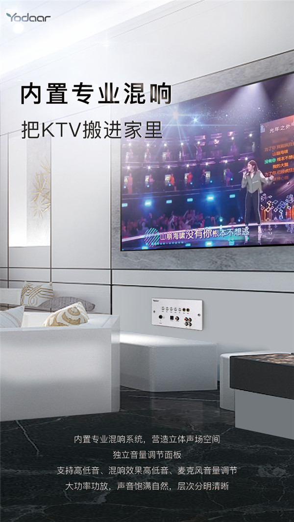 不同于一般K歌系統(tǒng)需要占用很多空間,悠達(dá)客廳K歌系統(tǒng)不僅體積小,而且采用內(nèi)嵌入墻式安裝,既節(jié)省了空間,也能保證視覺上的簡(jiǎn)潔美觀。同時(shí),前面板外露墻面,又方便與電視、背景音樂系統(tǒng)連接,營造一個(gè)舒適、理想的K歌環(huán)境。